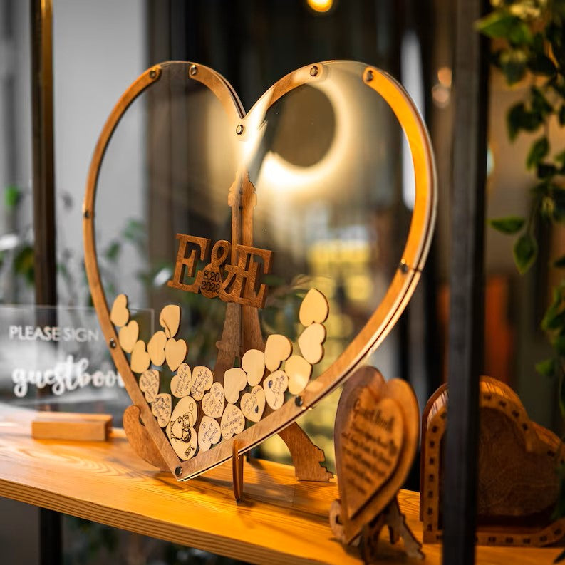 Notre livre en bois est conçu avec amour et est parfait pour capturer les moments précieux d'un mariage ou de tout autre événement spécial. Les cœurs personnalisables peuvent contenir des messages d'amour et de bienveillance des invités, ce qui en fait un souvenir unique et précieux pour les années à venir.