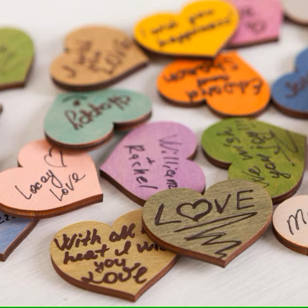 - 25 cœurs en bois personnalisables avec les noms des mariés ou de la personne qui célèbre l'occasion