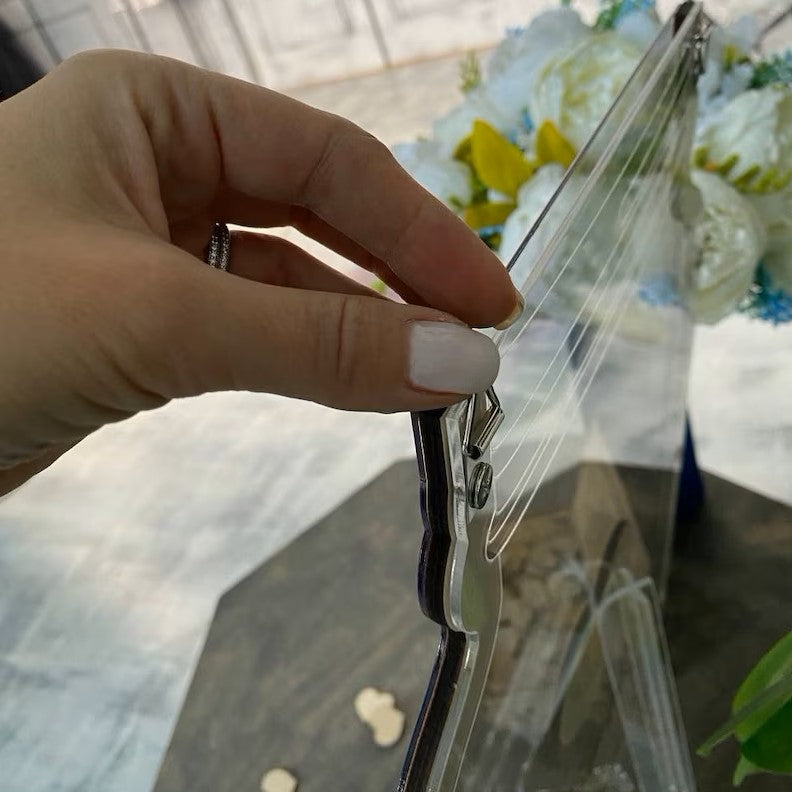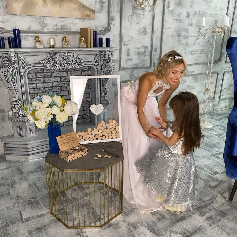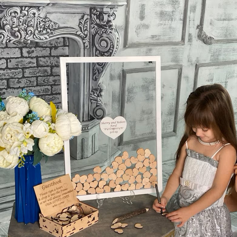 Le cadre rectangulaire en bois mesure 20 x 30 cm et est fabriqué en bois de haute qualité. Il est livré avec 25 cœurs en bois personnalisables avec les noms des mariés ou de la personne qui célèbre l'occasion, ainsi qu'un petit message de la part des invités. Les cœurs sont insérés dans une boîte à l'arrière du cadre pour une présentation élégante. Ce cadre est un excellent moyen de se rappeler les moments forts de votre événement spécial.