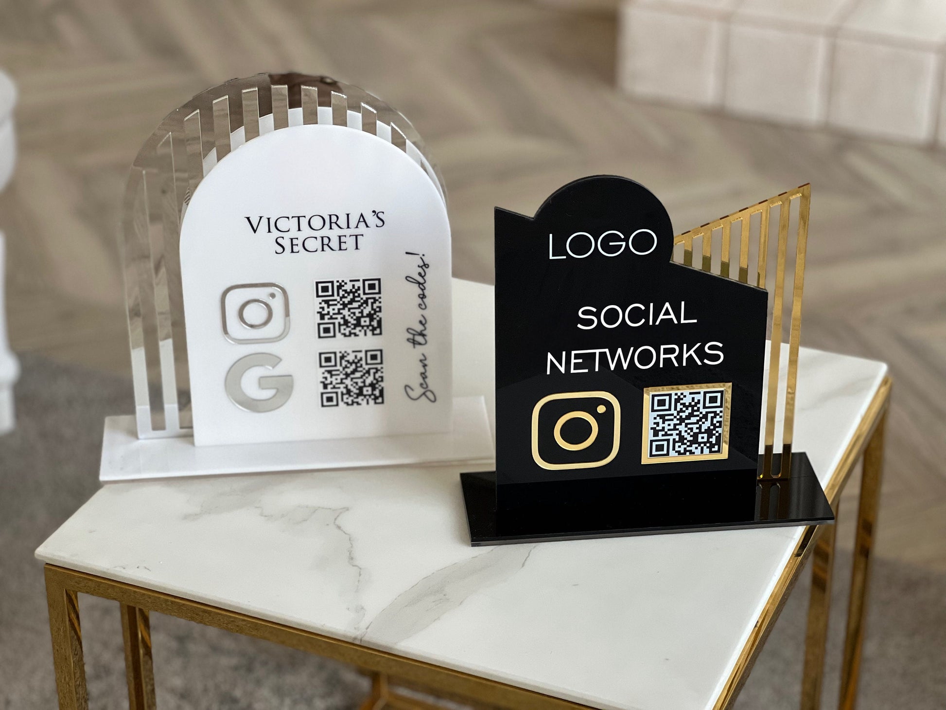 Apportez une touche d'élégance à votre espace avec cette enseigne de code QR personnalisée, fabriquée en plexiglas doré et blanc. Idéale pour les entreprises souhaitant allier modernité et sophistication, cette enseigne est conçue pour diriger vos clients vers votre site web, vos réseaux sociaux ou toute autre information pertinente.
