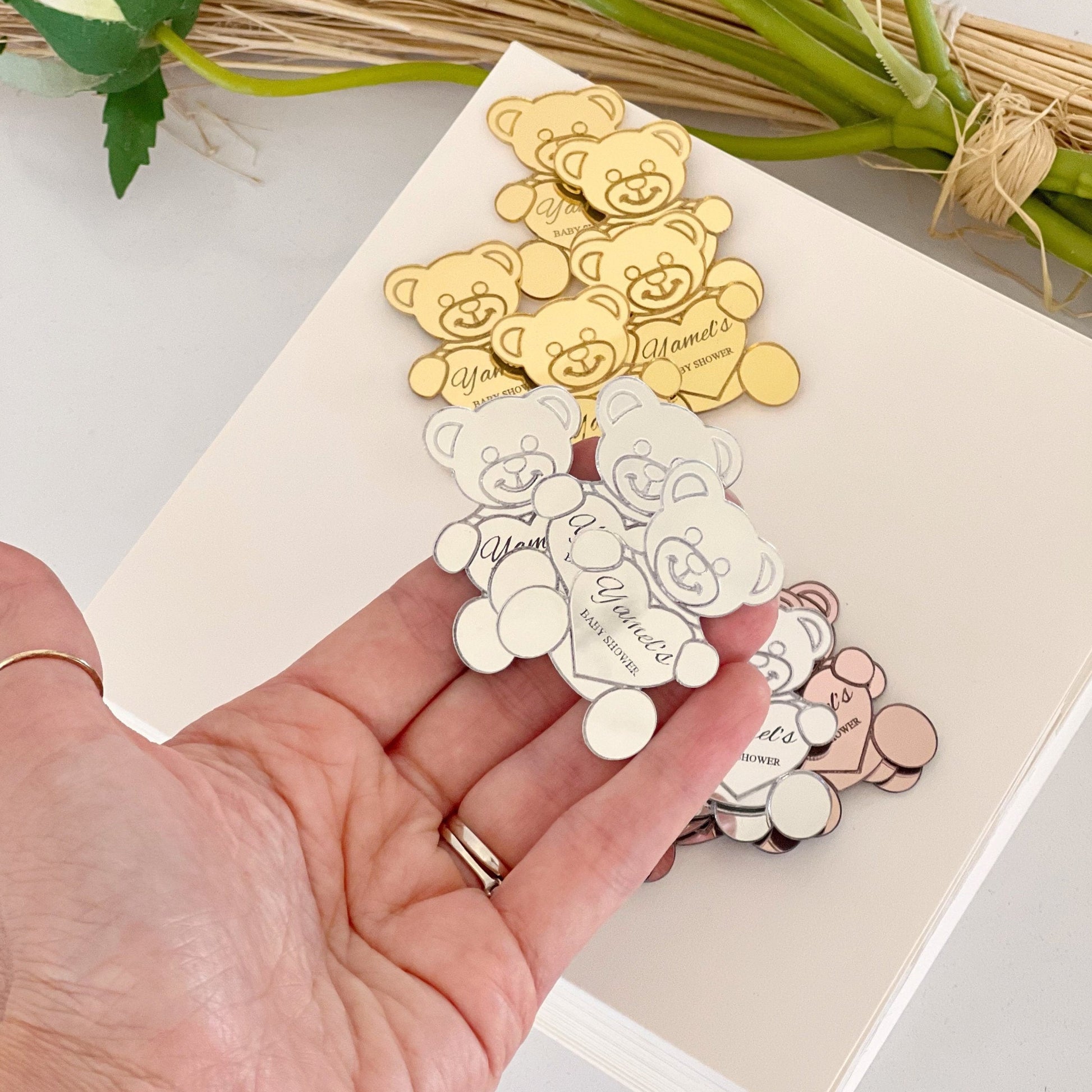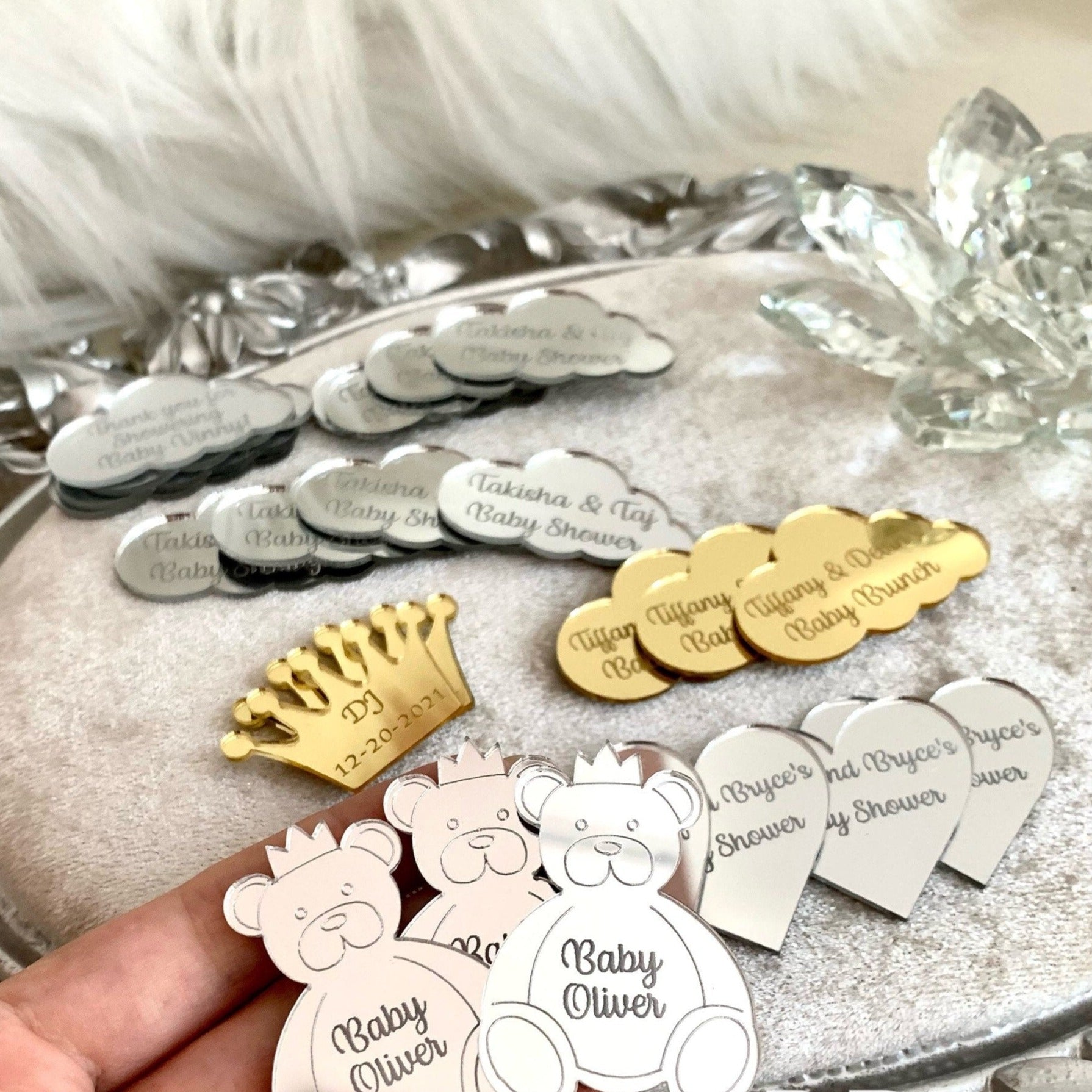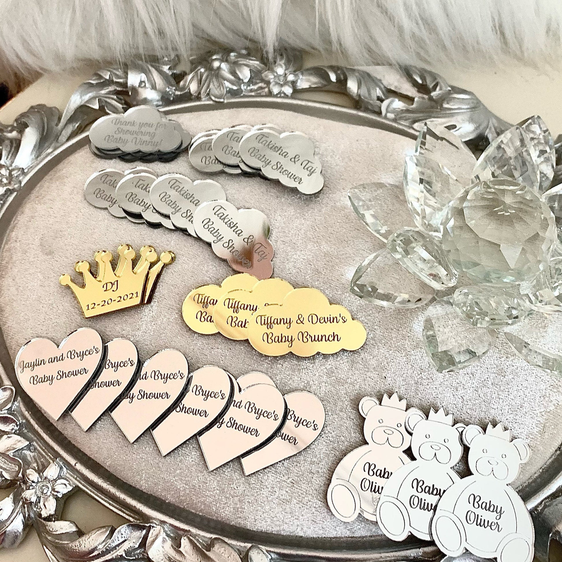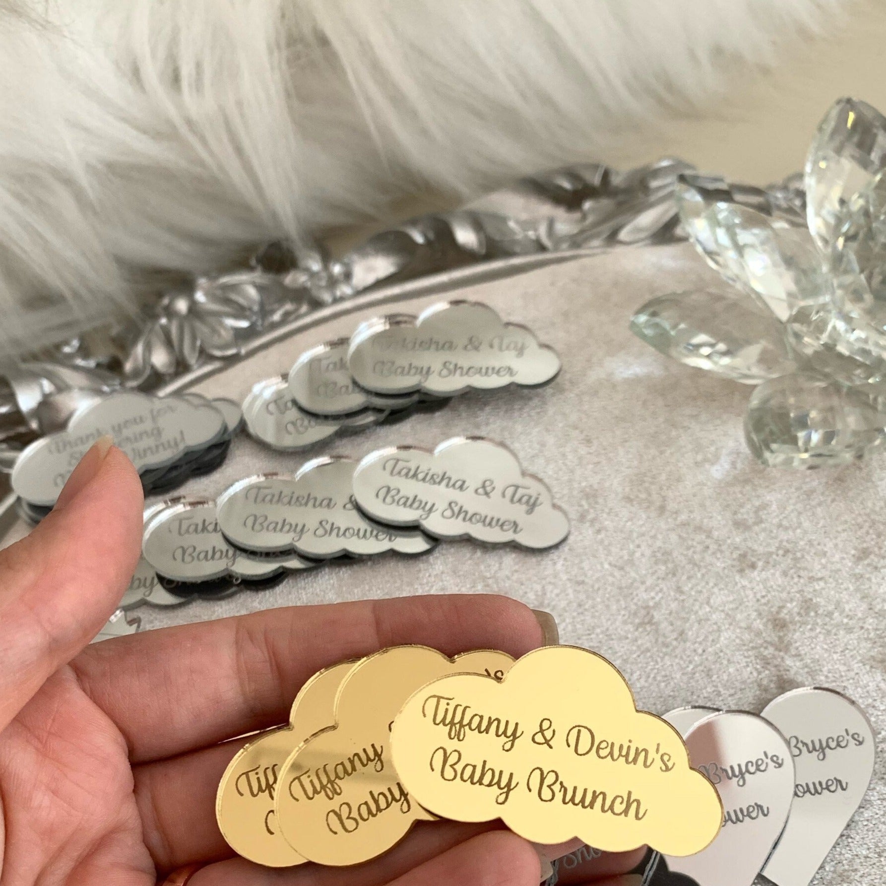 Nos étiquettes de miroir en acrylique sont fabriquées avec soin et sont disponibles en forme de cœur, d'étoile ou de cercle, pour correspondre parfaitement à l'occasion. Chaque étiquette peut être personnalisée avec un nom, une date ou un court message, ce qui en fait un détail unique et mémorable pour vos invités.