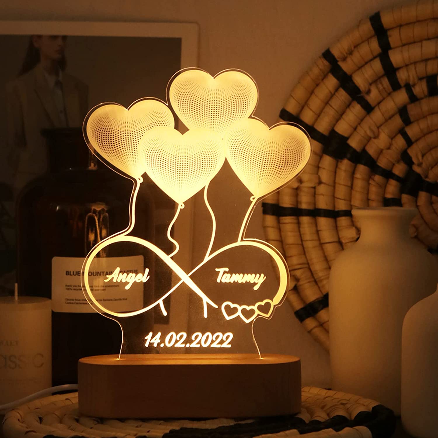 La lampe 3D d'illusion acrylique est le cadeau parfait pour célébrer l'amour entre deux personnes. Elle est composée de quatre coeurs superposés et reliés par un signe d'infini. Vous pouvez personnaliser cette lampe en y insérant les noms de votre couple et la date de votre choix. Cette lampe décorative de haute qualité est faite à partir d'acrylique et a un effet 3D qui crée une illusion d'optique.