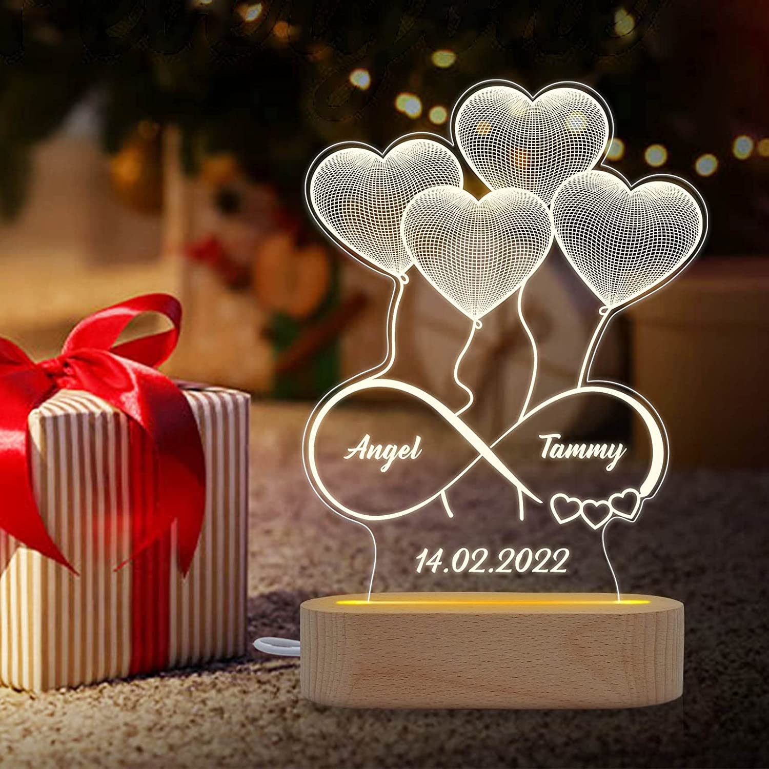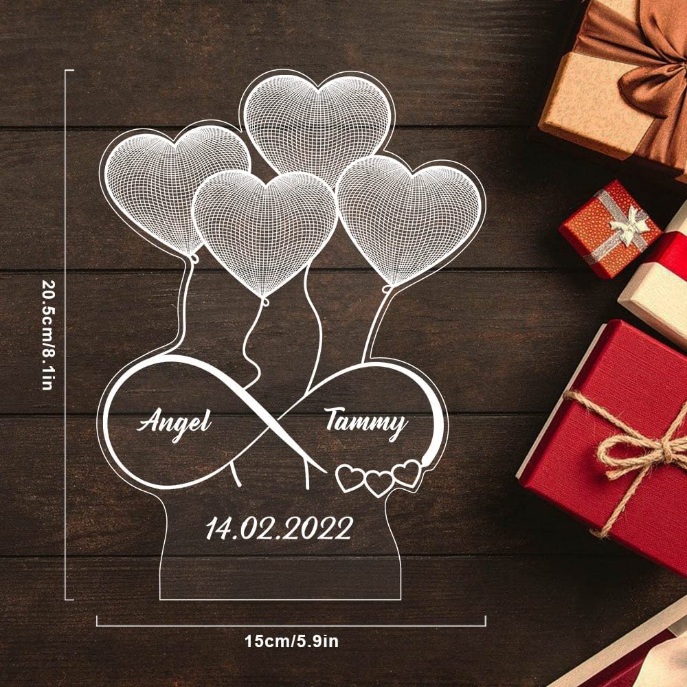 Offrez une lampe 3D d'illusion acrylique avec des coeurs en haut et un signe d'infini en dessous, personnalisée avec les noms des couples et leur date.