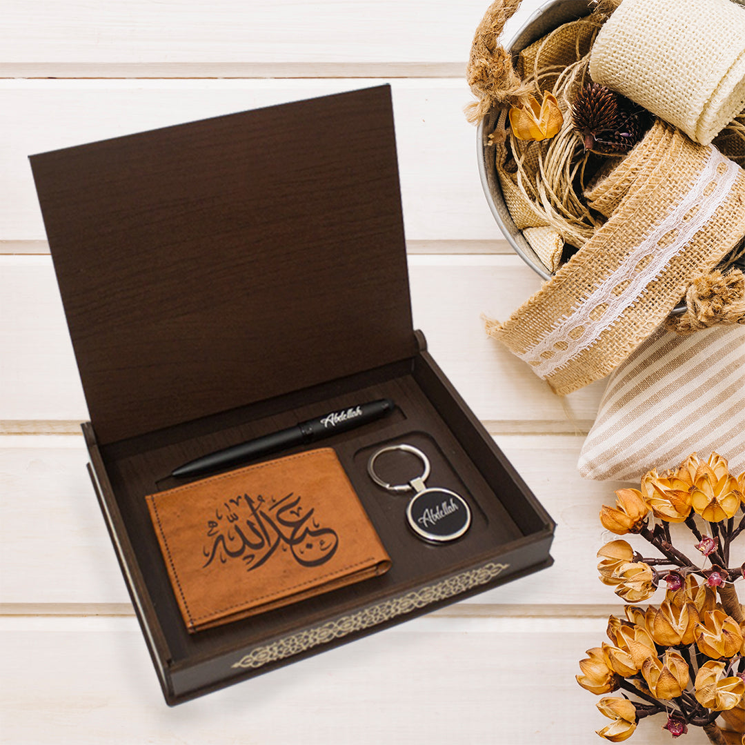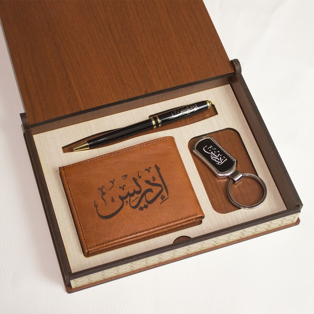 Le pack Saul comprend un portefeuille en cuir haut de gamme, un stylo élégant et un porte-clés en métal robuste. Le portefeuille offre suffisamment d'espace pour ranger les cartes de crédit, les billets de banque et les pièces de monnaie, tandis que le stylo offre une prise en main confortable pour écrire facilement. Le porte-clés permet de garder les clés en sécurité et facilement accessibles.