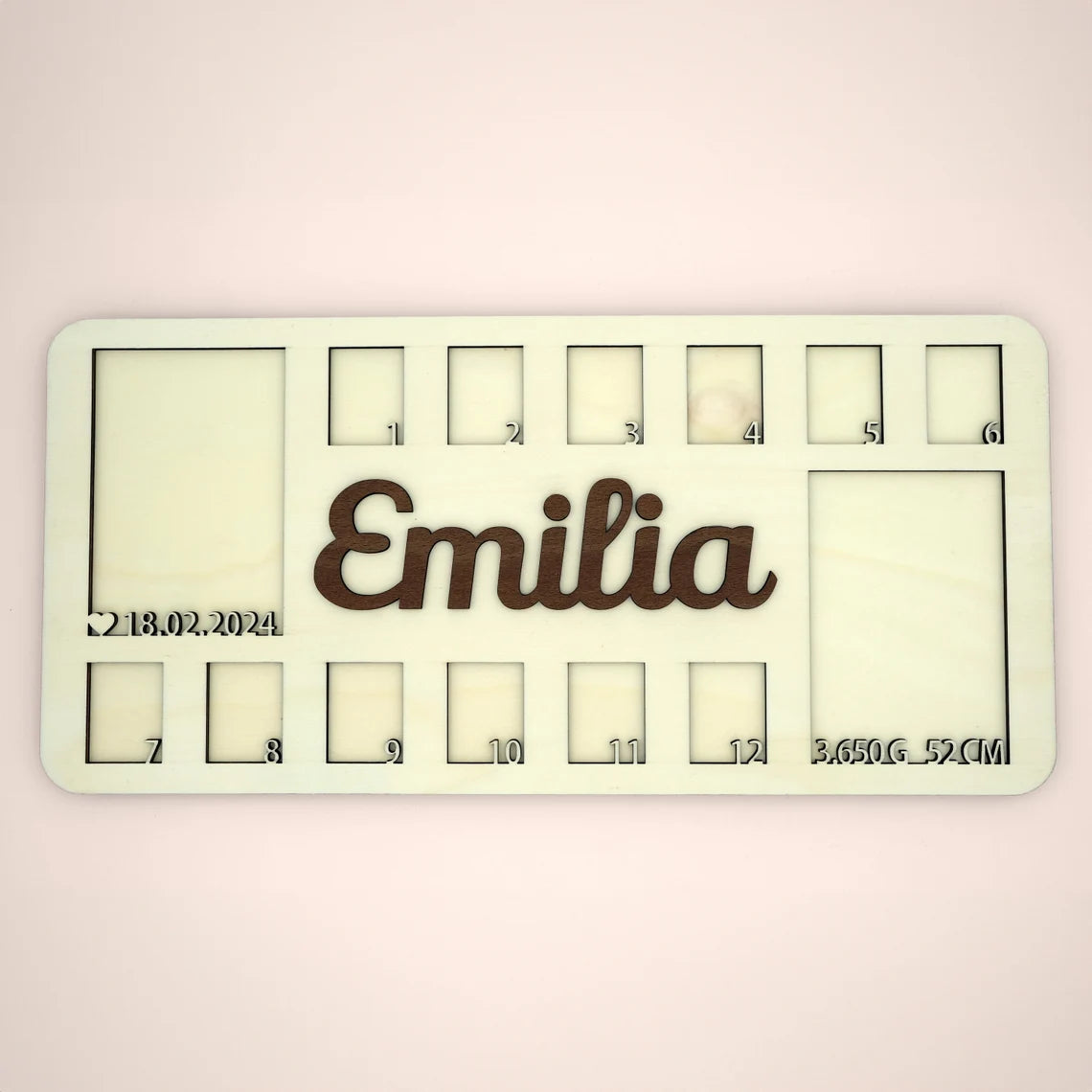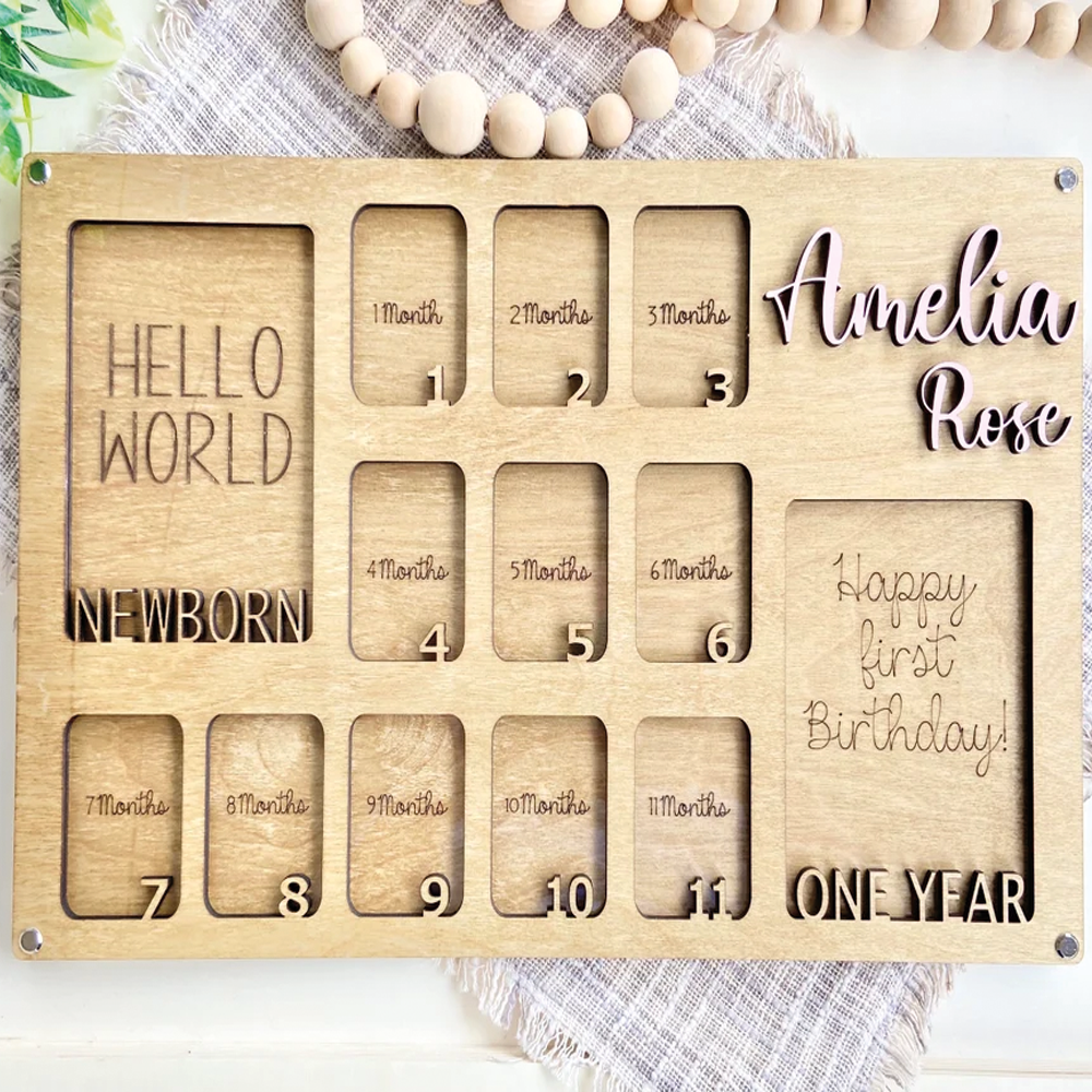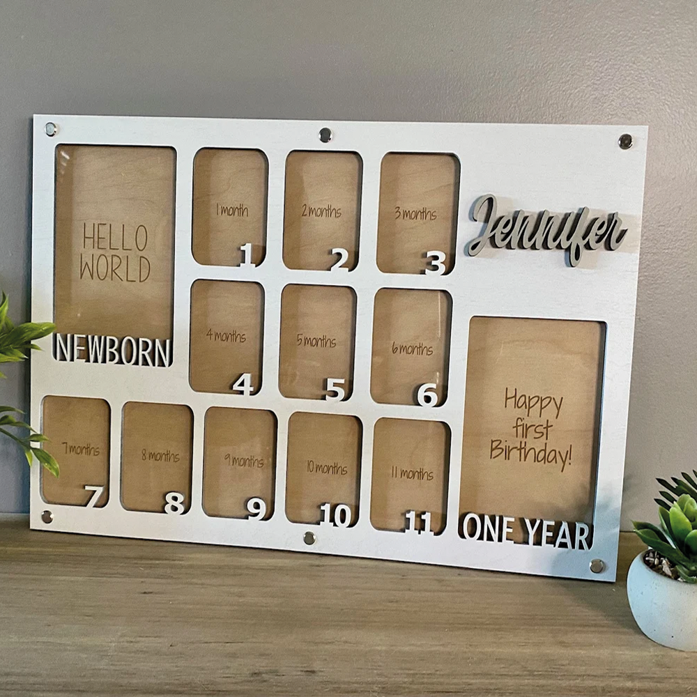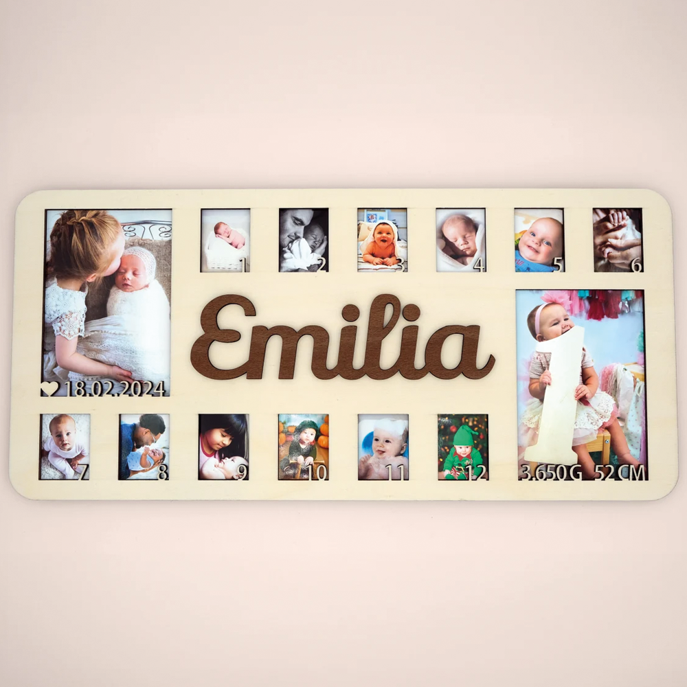 Capturez chaque précieux moment de la première année de votre bébé avec notre tableau photo personnalisé. Fabriqué en bois double de haute qualité, ce tableau mesure 45 cm de largeur et 30 cm de hauteur, offrant suffisamment d'espace pour afficher douze photos, une pour chaque mois de la première année de votre enfant.