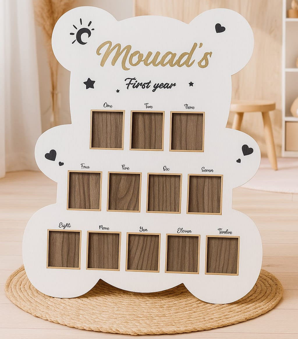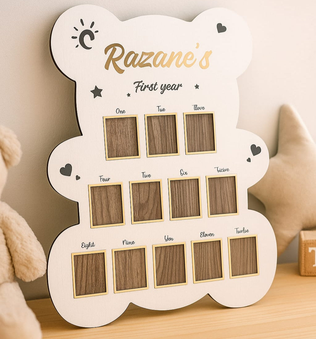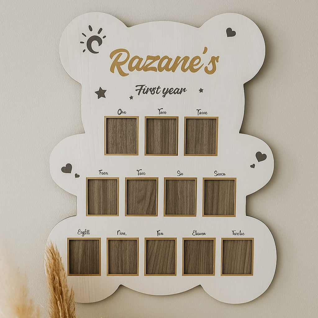 Offrez-vous (ou offrez à de jeunes parents) un tableau unique pour immortaliser les 12 premiers mois magiques de bébé. Avec ses emplacements photo numérotés de 1 à 12 mois et la personnalisation du prénom, ce tableau devient bien plus qu’un objet de déco : c’est une capsule d’émotions.