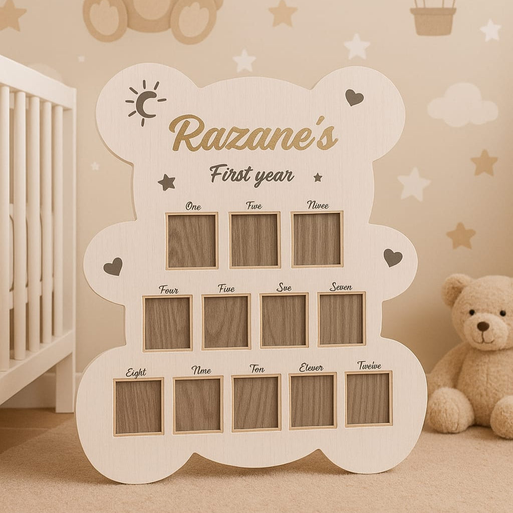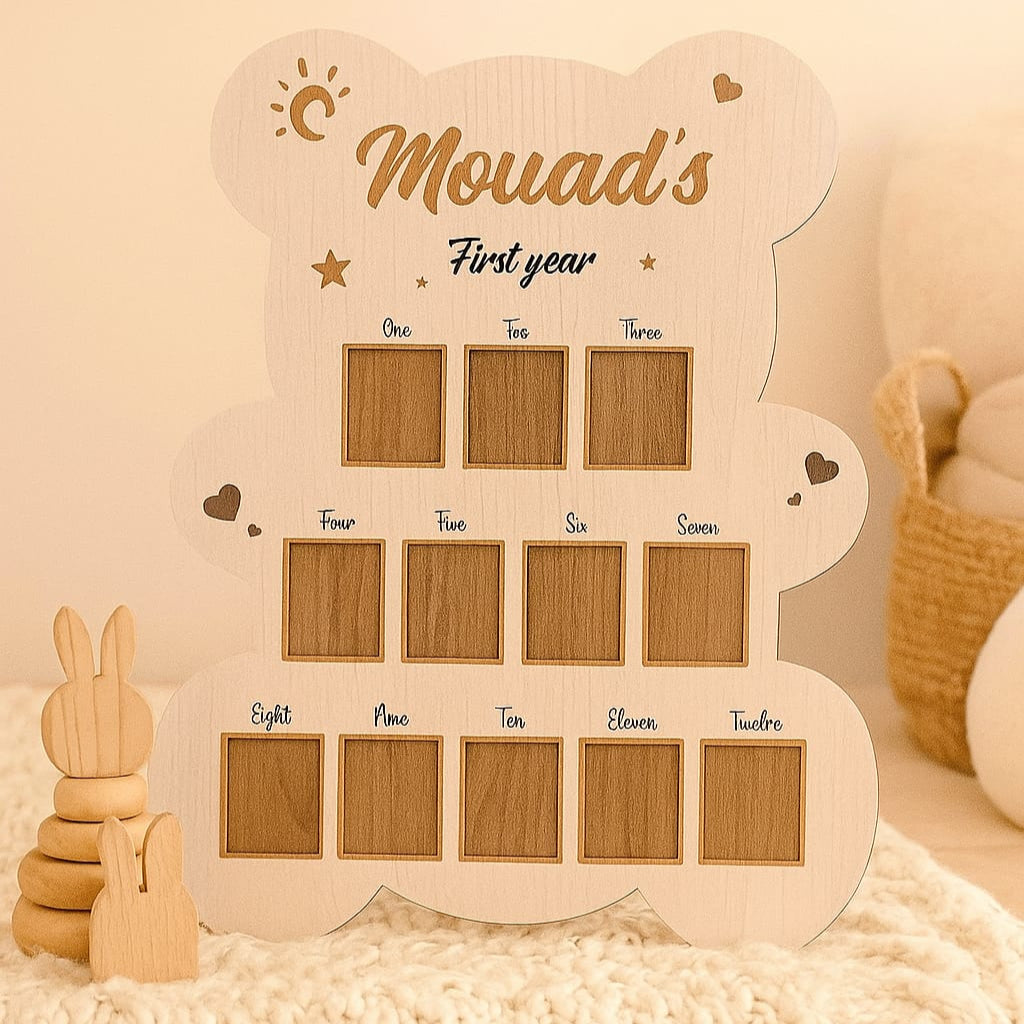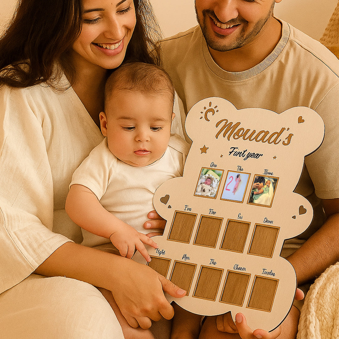 Offrez-vous (ou offrez à de jeunes parents) un tableau unique pour immortaliser les 12 premiers mois magiques de bébé. Avec ses emplacements photo numérotés de 1 à 12 mois et la personnalisation du prénom, ce tableau devient bien plus qu’un objet de déco : c’est une capsule d’émotions.